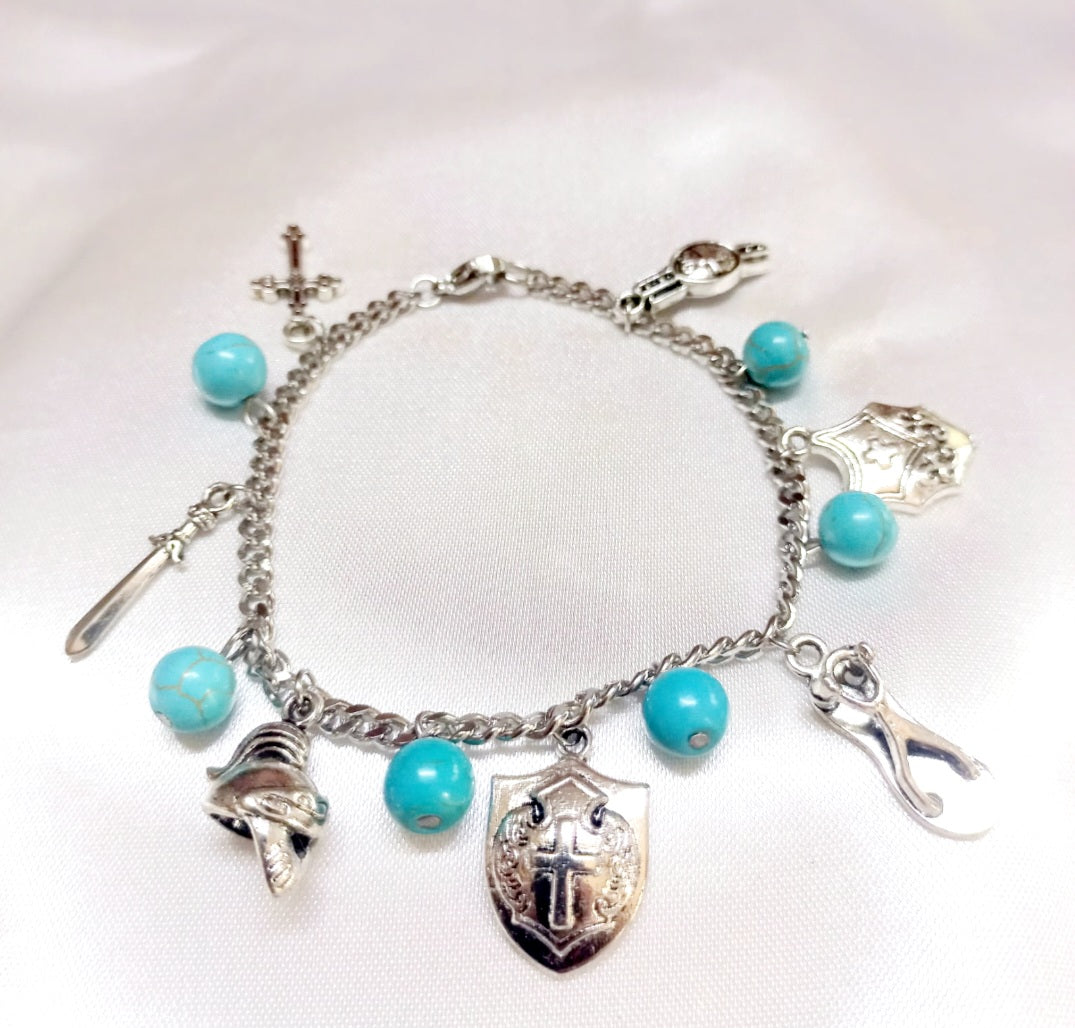 Crafted from durable stainless steel, the Armour of God bracelet features delicate small charms symbolizing spiritual protection, paired with vibrant turquoise beads that add a touch of natural elegance. This balance of strength and style offers a timeless accessory designed to inspire confidence and faith throughout your day. Its resilient materials ensure long-lasting wear while maintaining a refined, expert-crafted aesthetic.