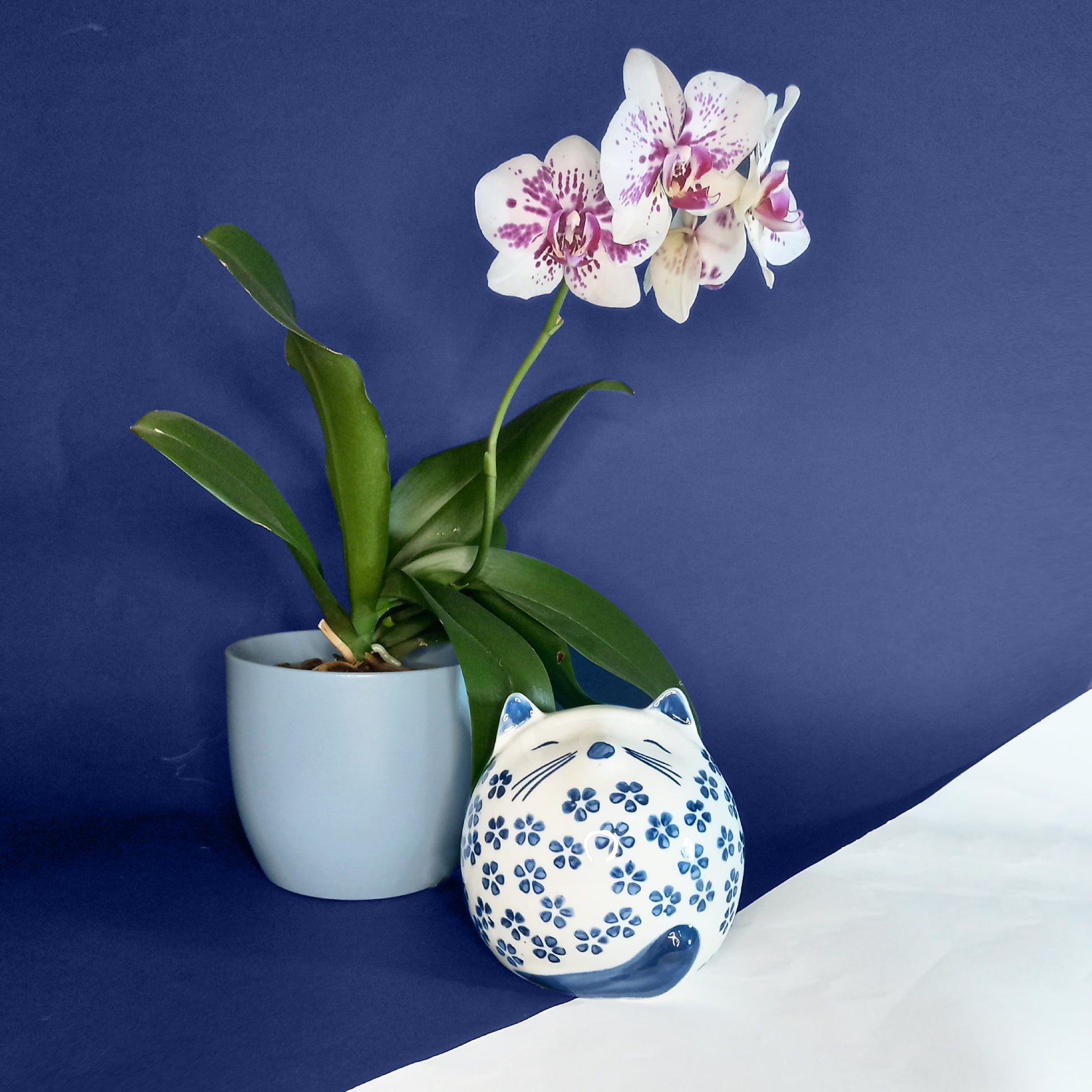 This striking ceramic cat figurine features an enchanting daisy design that captures feline grace with botanical elegance. Handcrafted from premium ceramic, it showcases meticulous attention to detail and durability. The blue palette complements contemporary and traditional interiors alike, making it an ideal accent piece for shelves, desks, or windowsills. Perfect for cat enthusiasts and nature lovers, this decorative piece brings warmth and personality to any room while serving as a thoughtful gift for those who appreciate artisanal craftsmanship.