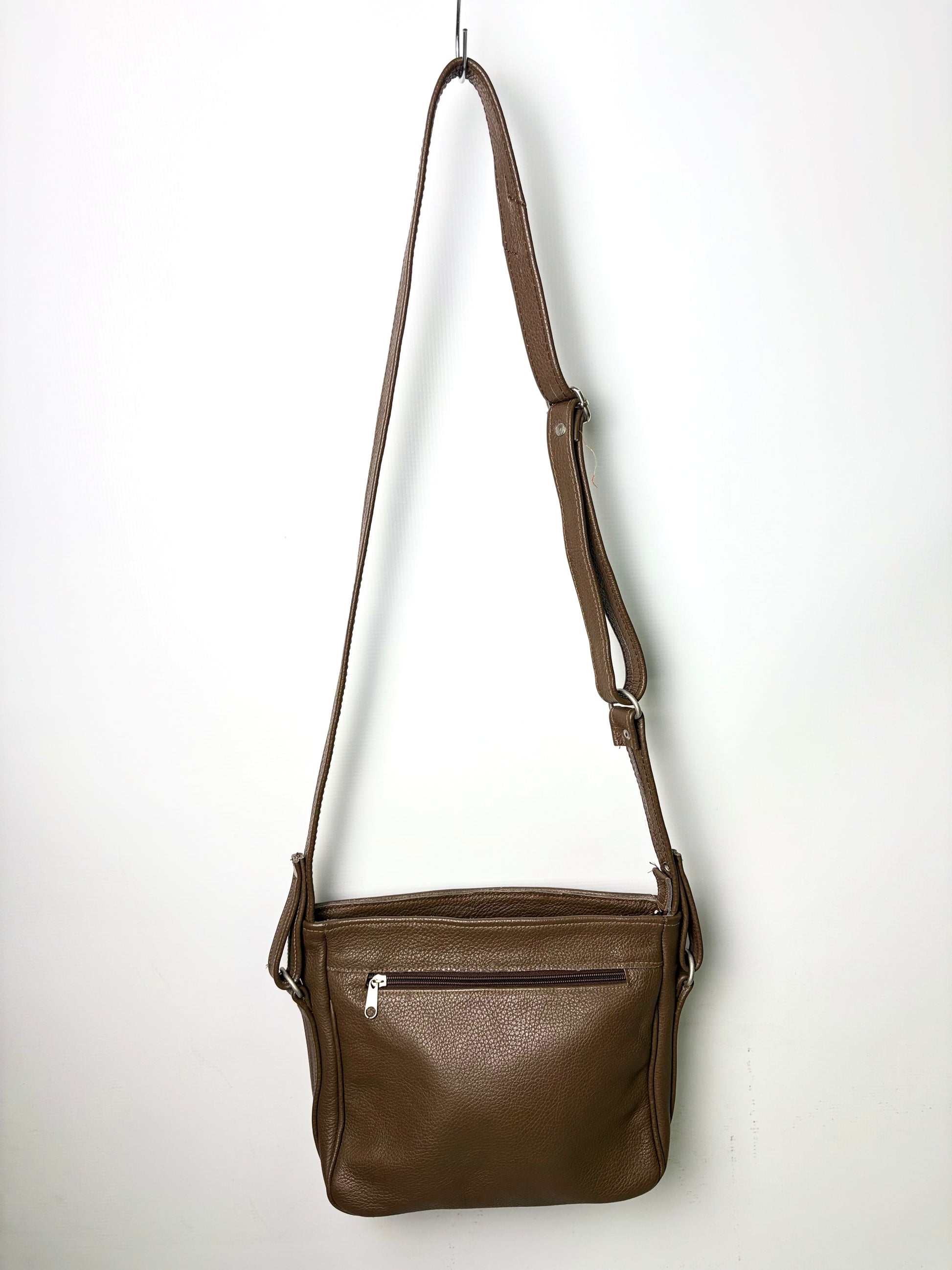 The Brown Leather Crossbody Bag is crafted from durable btown leather, featuring an adjustable strap for personalized comfort. It includes four zipper compartments, offering efficient organization for essentials. This design enhances accessibility and security, making it suitable for both daily use and travel.