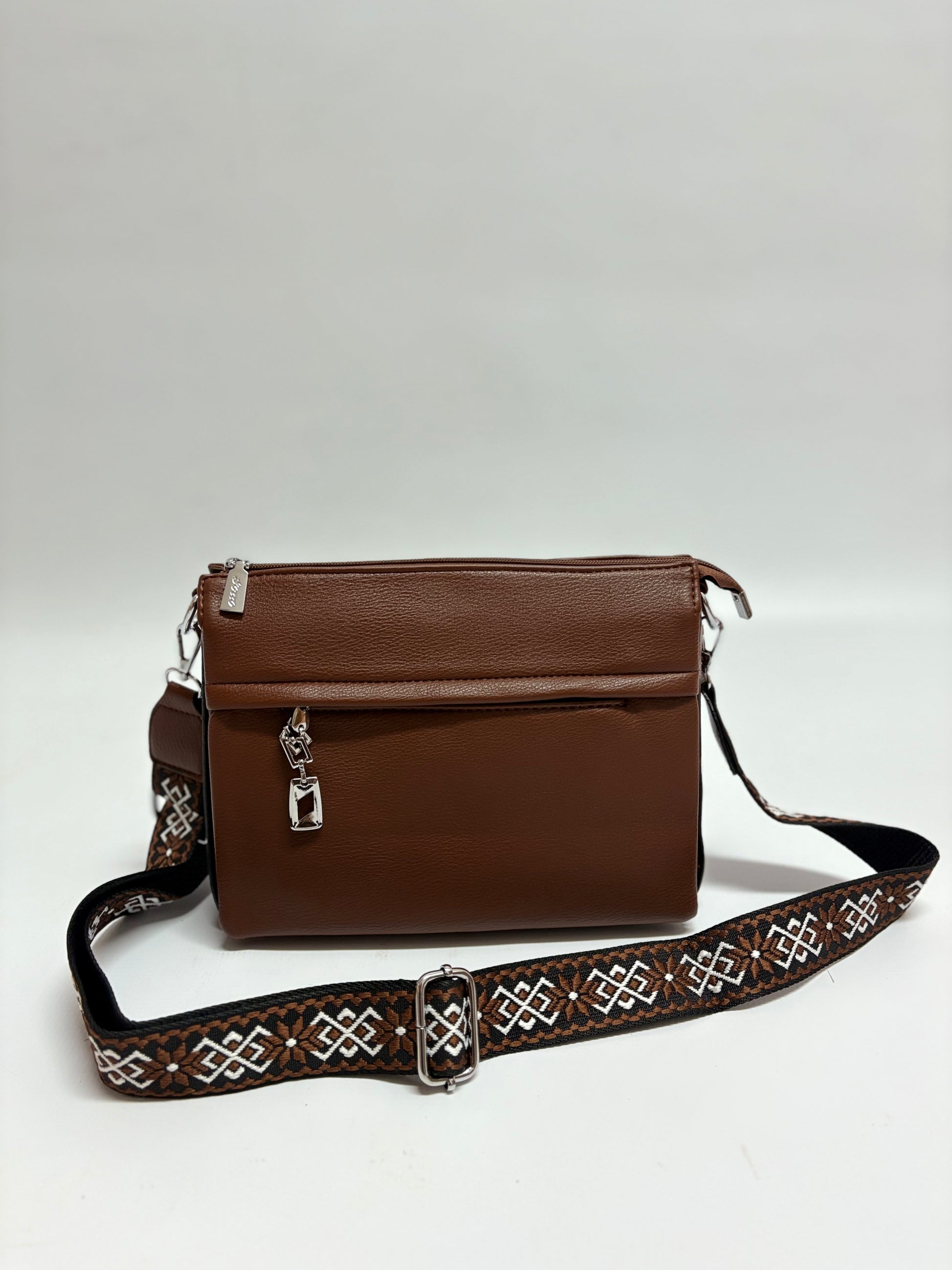 Add a touch of earthy elegance to your everyday style. This rich chocolate-brown crossbody is elevated by its bold, patterned strap — a blend of practicality and personality.